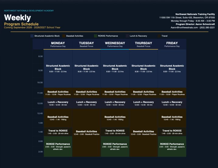 The Northwest Nationals Development Academy is designed to provide serious student-athletes with a structured, high-performance environment that integrates academics, baseball development, and athletic performance training. Beginning in September 2026 for the 2026–2027 school year, our Monday–Friday program runs from 8:30 AM to 3:00 PM at the Northwest Nationals Training Facility, creating a complete daily routine built for long-term success.
